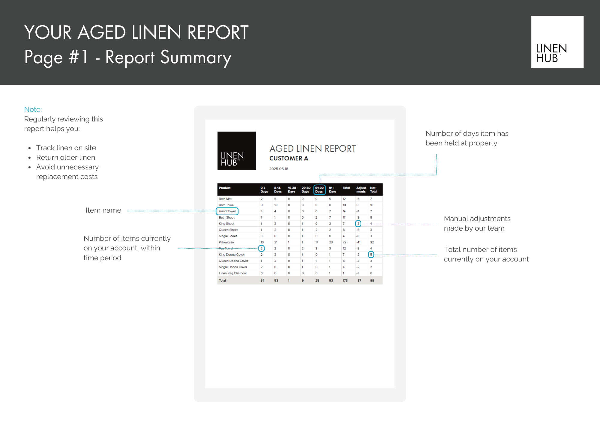 Your Aged Linen Report will help you easily track these details and gain a better understanding of your linen usage and associated costs.